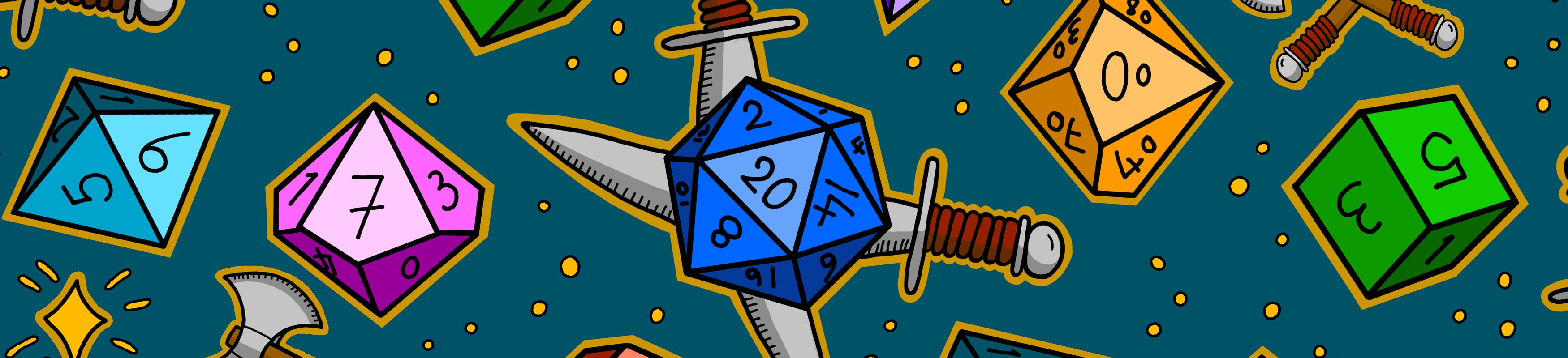 This collection was inspired by a set of dice and some basic weapons and made into a simple pattern with some added stars and sparkle. It features 7 different shaped dice, some throwing axes, swords and a great axe all in vibrant colours on a dark background.