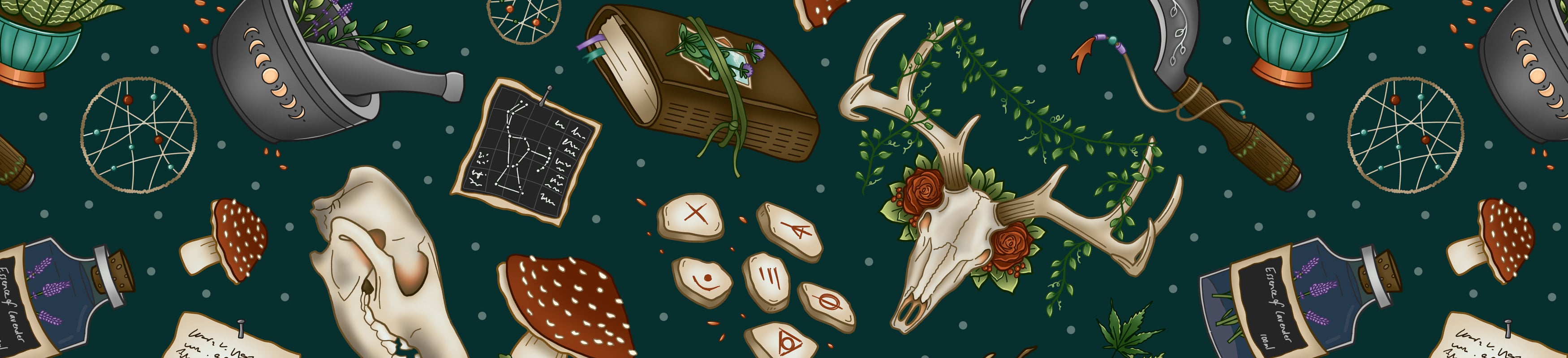 This collection is inspired by nature and features an array of mushrooms, potions, plants, runes, skulls, wild shaping references, star charts and dream catchers.