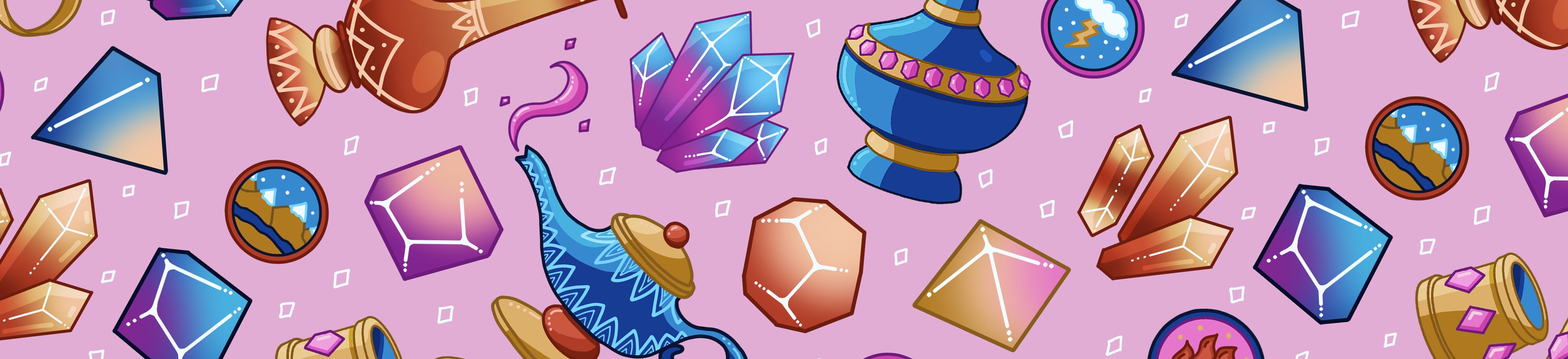 This collection is inspired by one of my characters Effi, who accidently took a pact with a Genie. The design contains items such as crystals, genie lamps, rings, cuffs, element tokens and crystal dice.