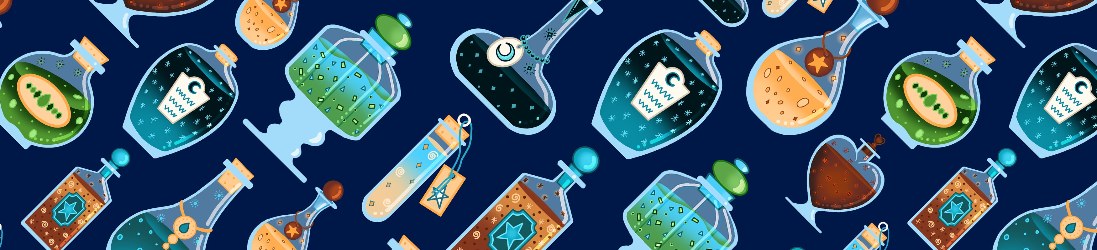 This collection was inspired by a multitude of different types of potions in different shaped bottles. It features an array of drawn potion bottles filled with colourful potions from health, mana, speed and darkness, you are welcome to make up what each of these potions might be.