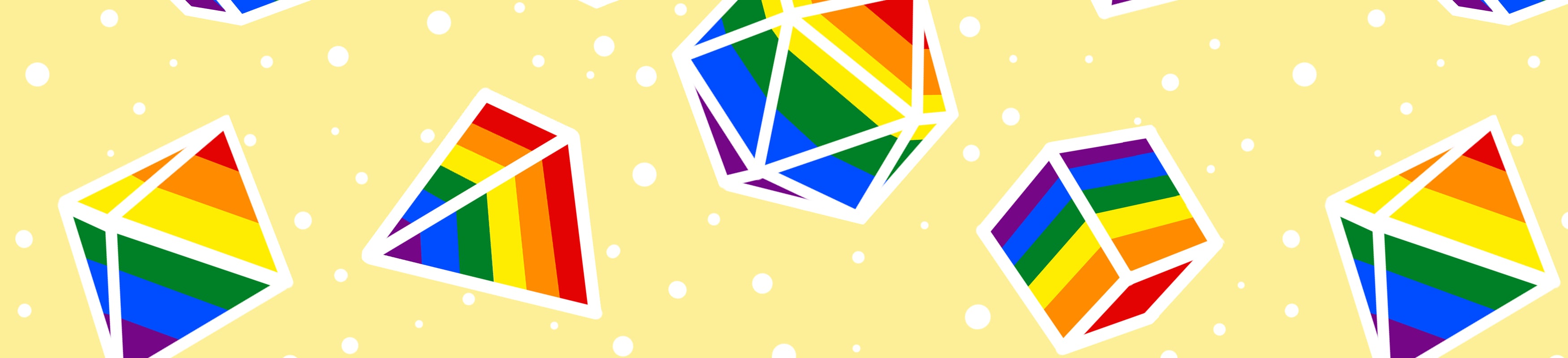 This Collection was inspired by Rainbows but also originally created for pride in 2021. It features all seven dice in rainbow colours with white outlines on a yellow background.