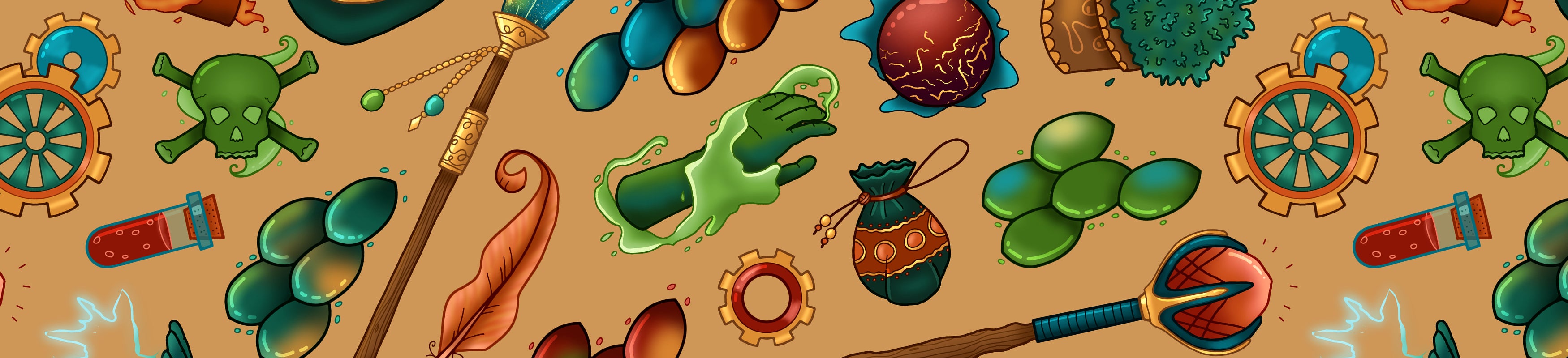 This collection is inspired by items that could be used by a Sorcerer to enhance their magic. There is even a polymorphed potted plant for the wild magic users. The design is filled with items such as dragon scales, cogs, potions, magic staffs, ingredients pouches and elemental symbols.