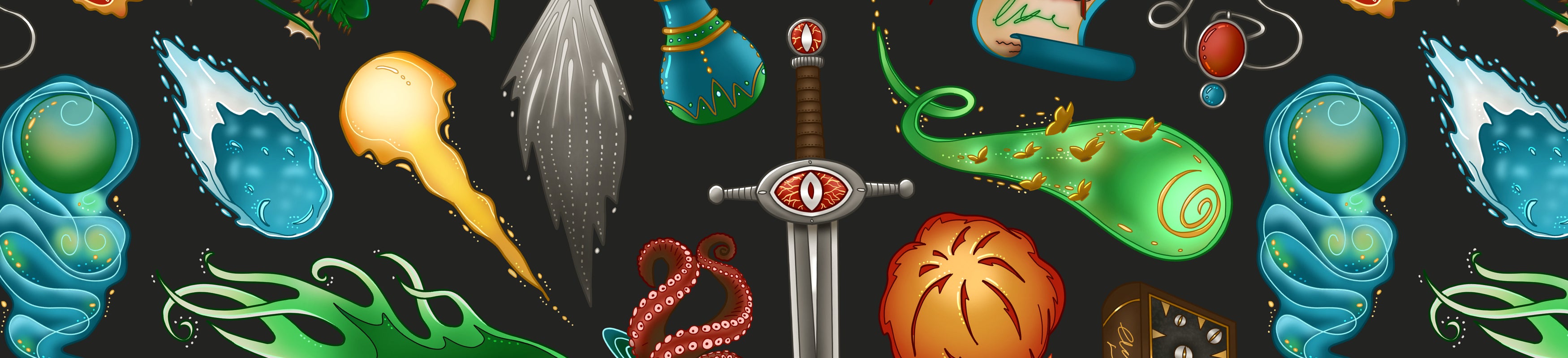 This collection is inspired by pact items and patron flavoured eldritch blasts. The design features items such as hex blades, bottles, monsters and familiars. I really like the flavoured eldritch blasts, can you guess which ones match which patrons?